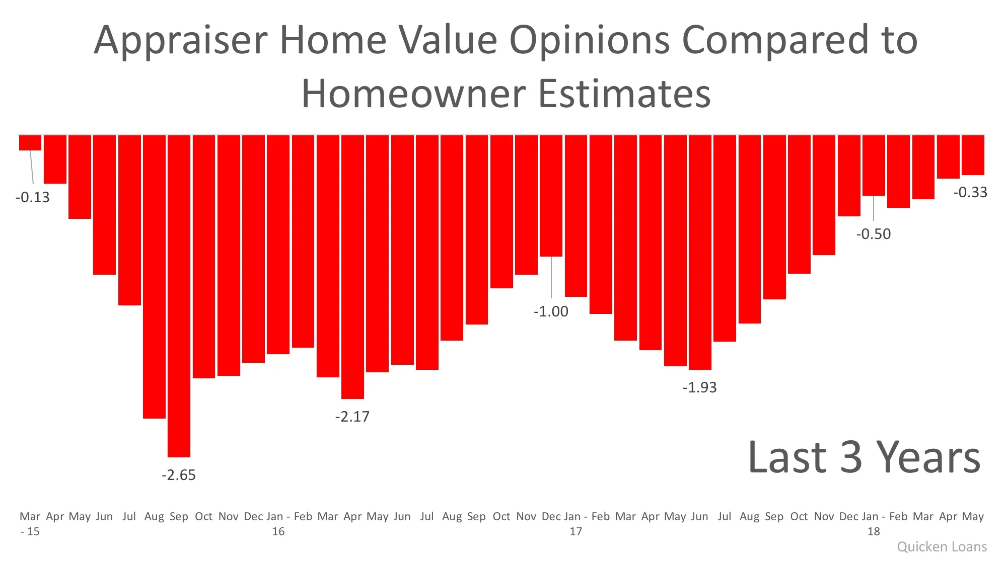 March 2015 marked the first month of a three-year gap between what an appraiser and a homeowner believed a home was worth. That gap widened to 2.65% in September 2015 and had consistently hovered between 1.0% and 2.0% through November 2017.